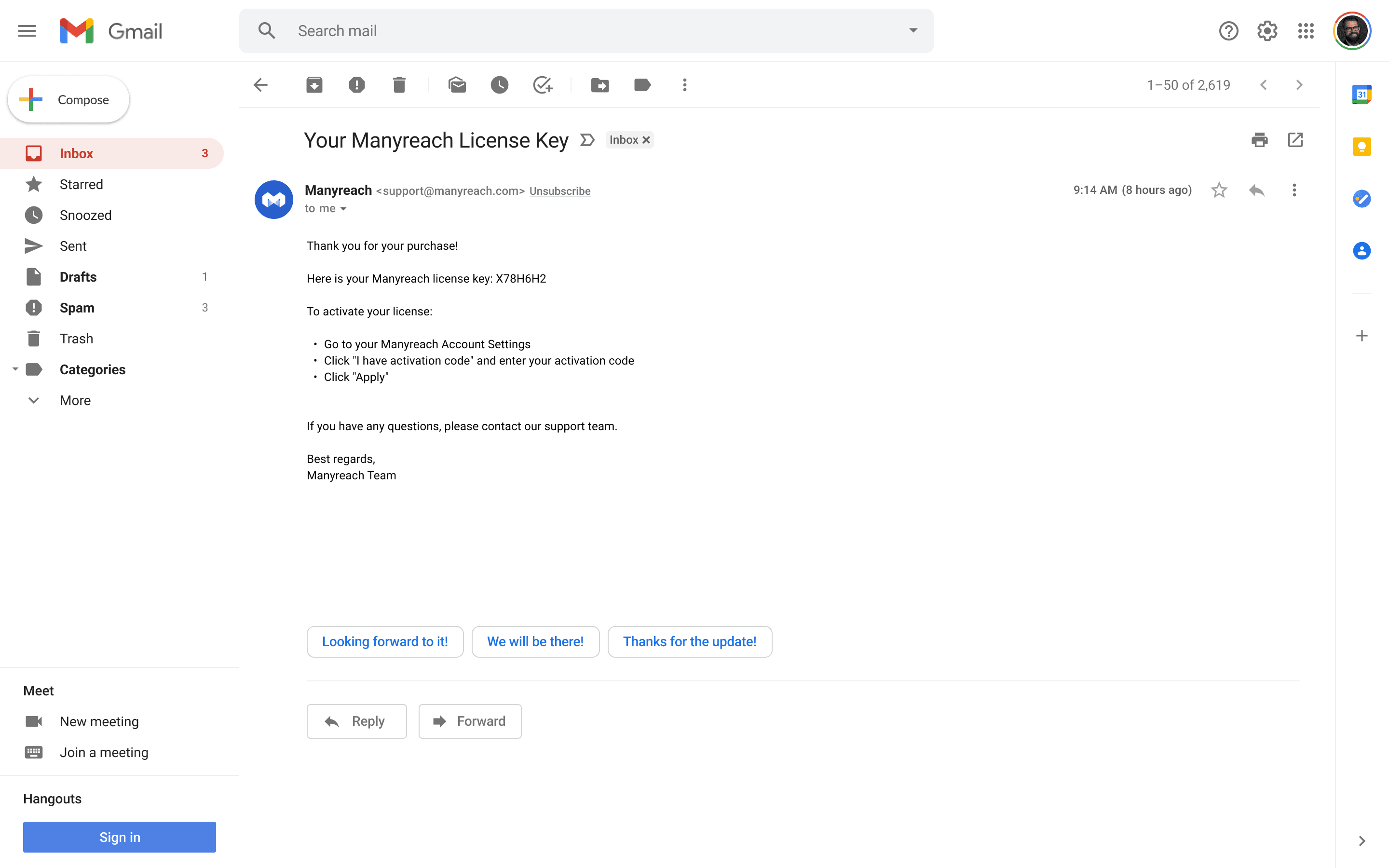 Check your email for a message sent from notifications@manyreach.com